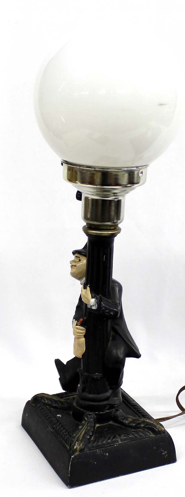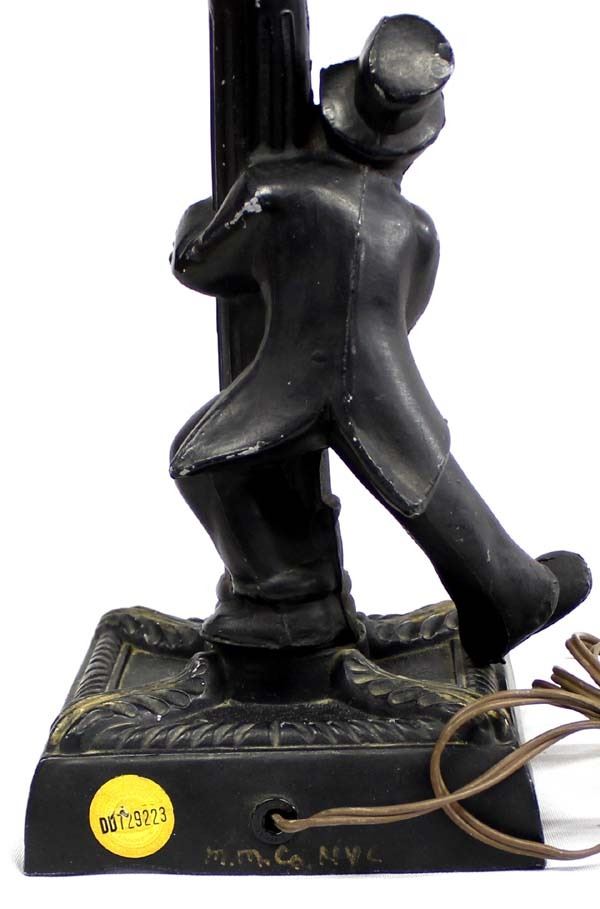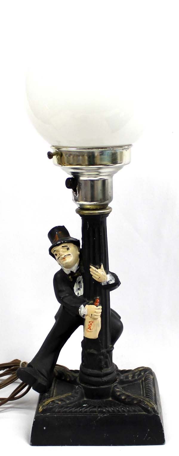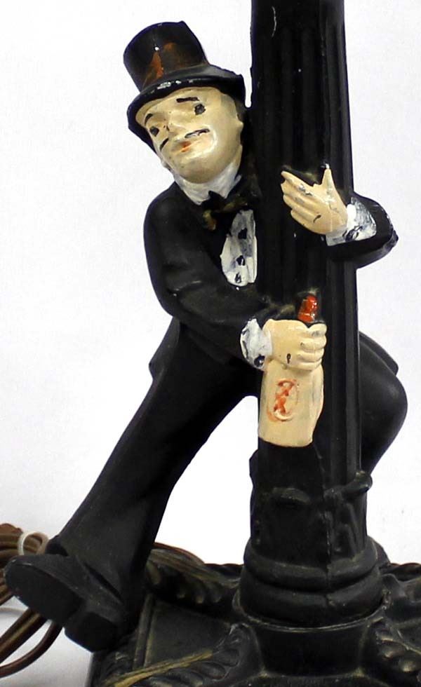 Vintage Cast Metal Drunk Hobo with Whiskey Bottle Hanging onto Lamp Post Barware Electric Lamp, plastic globe, measures 18''H x 6.25''W x 5''Deep, back is marked M. M. Co. NYC