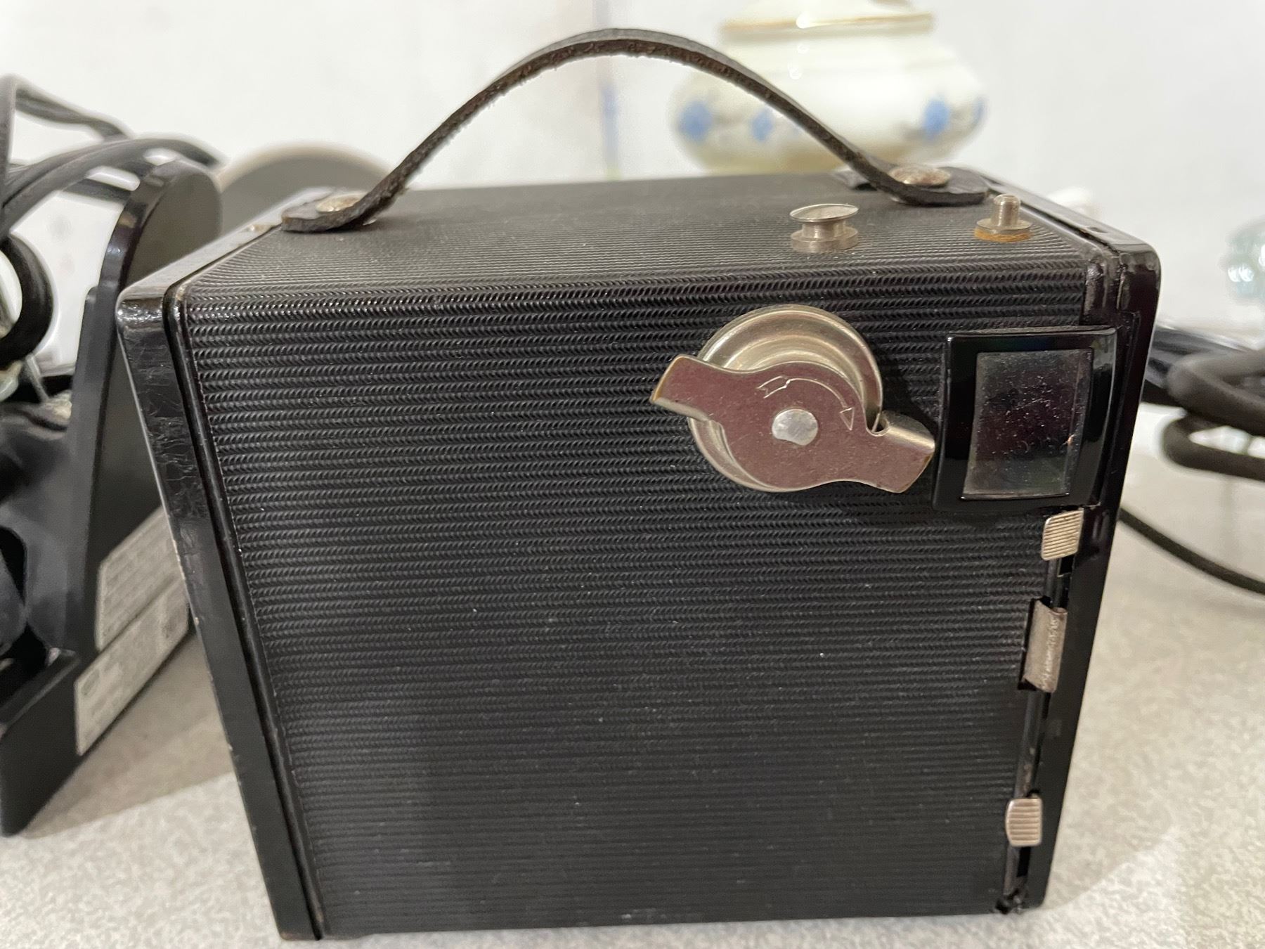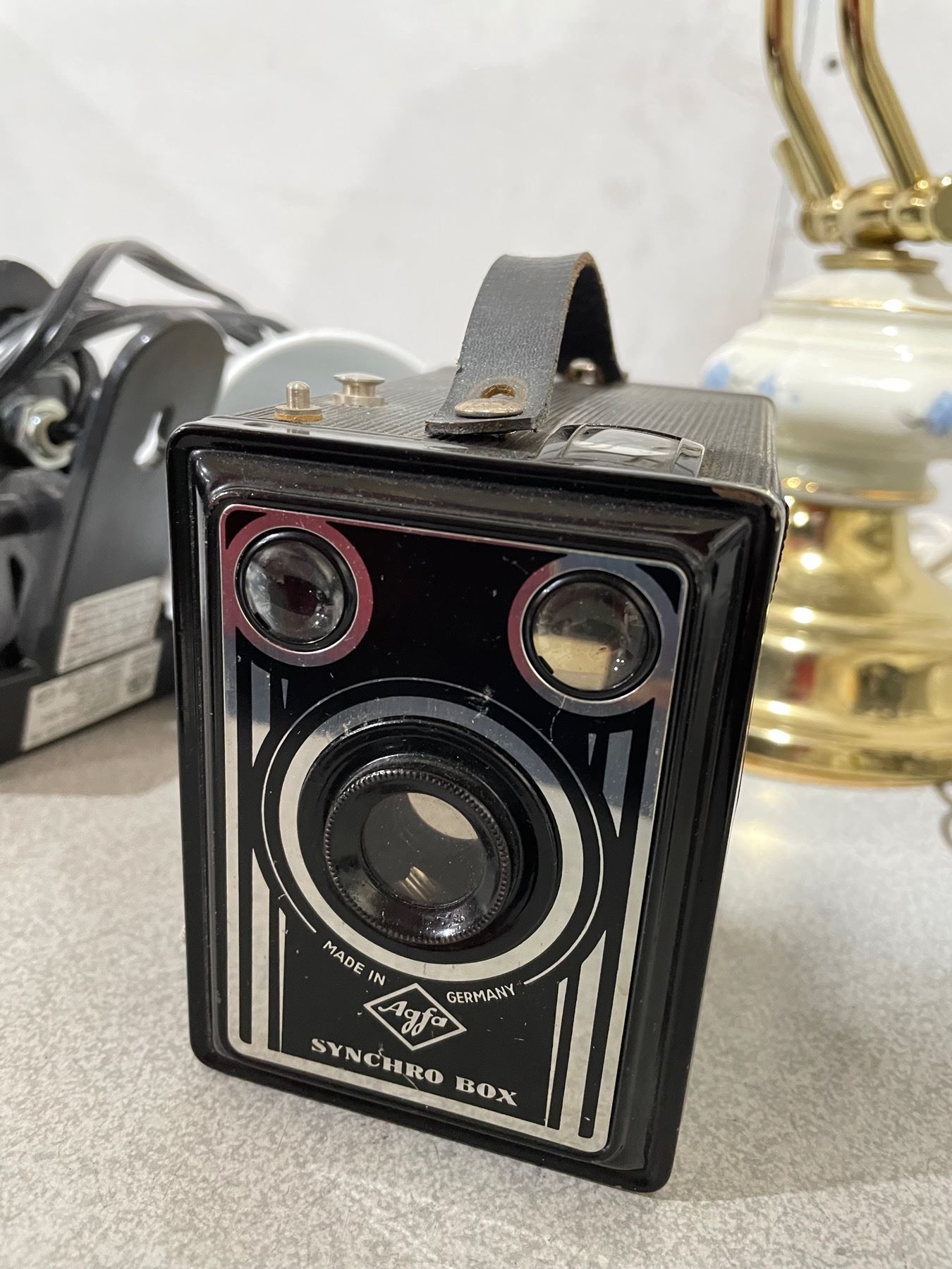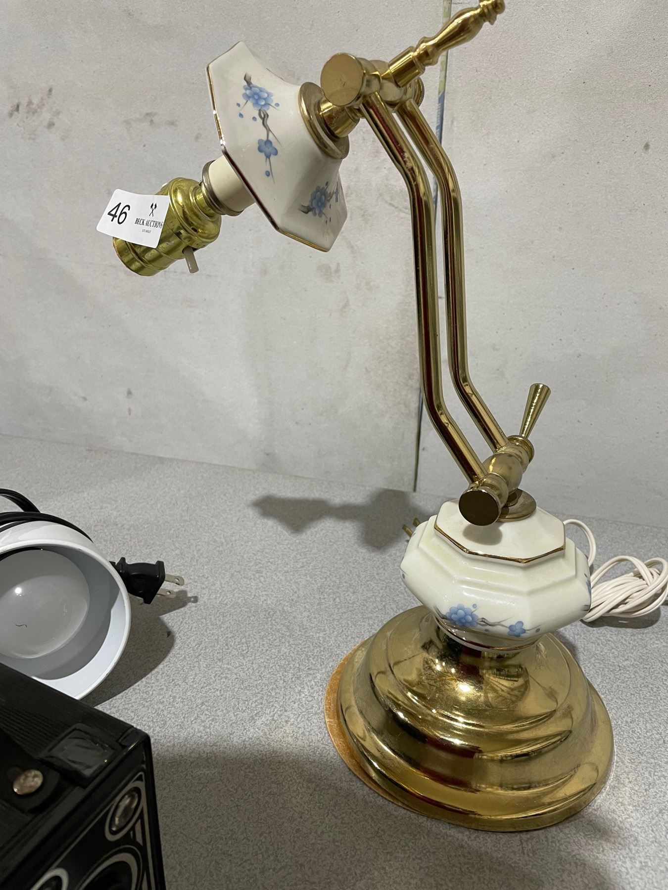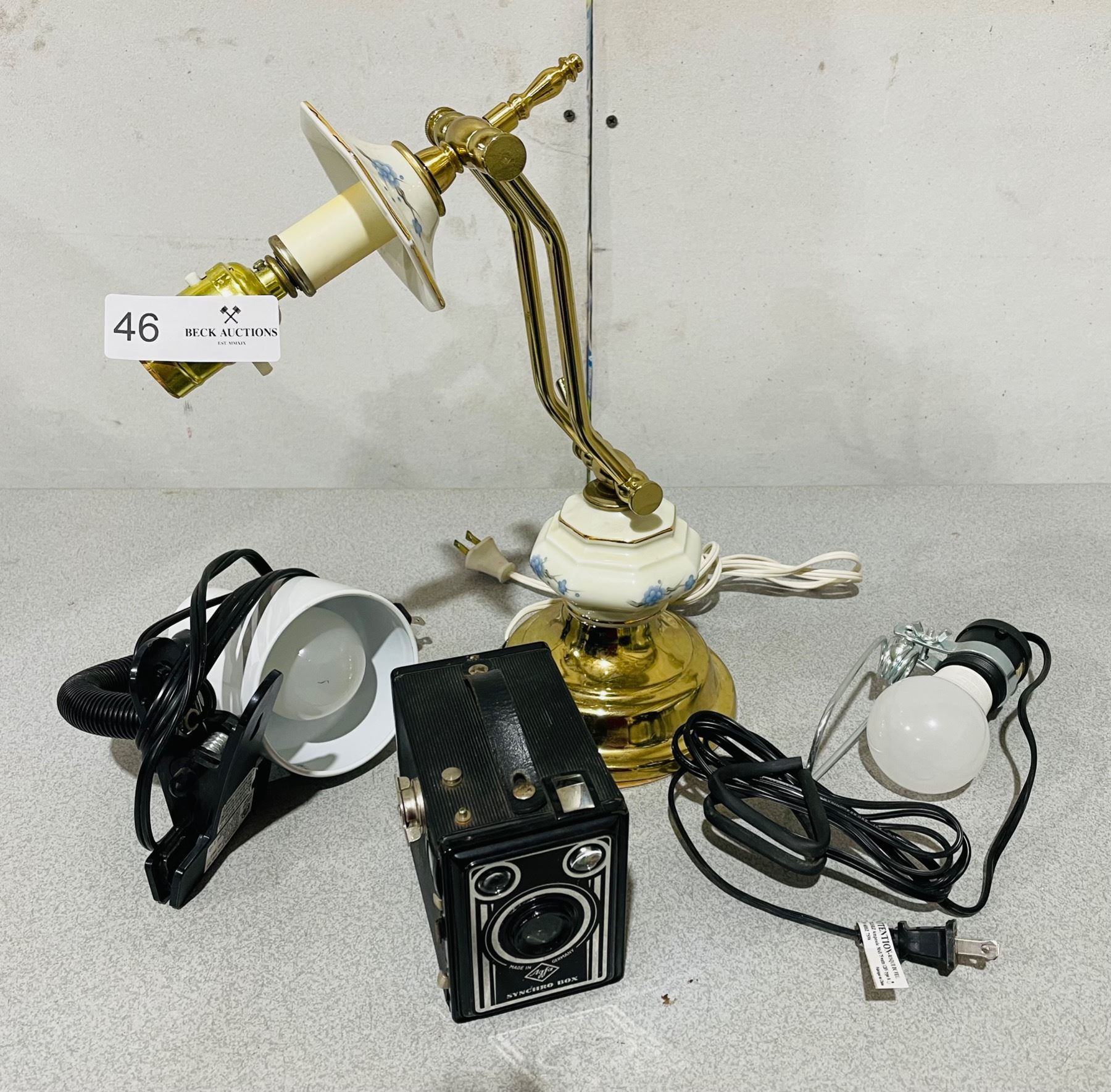 Lot of three lamps, includes 2 chip on style lamps and a porcelain jointed lamp (missing shade) Comes with a vintage untested box camera.