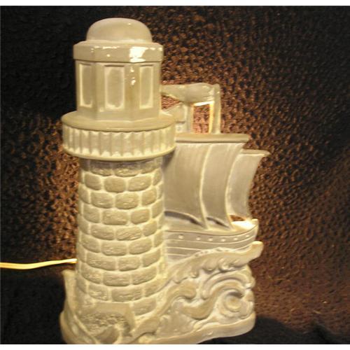FREE SHIPPING This lamp is one from the early 50's and has a markk at the top of the light house, the cord is a bit stiff, otherwise it is in pretty good condition. As you see from the pictures it still works well. The light is only for ambiance and gives off a soft glow. It was use atop a TV to cut glare. The last picture was taken with a flash so that greater detail could be shown.