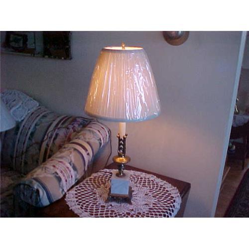 Lamp Victorian style, , brass, marble, bronze base; 26" tall X 5" sq. base; Condition, ready for use, but brass could use some polishing and an electric bulb. Has a new 6 X 10 X 12 Beige shade; beautifully designed lamp;