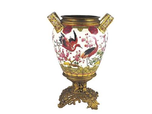 Gilt old style base, majolica lamp. On the side there are blossoming branches and cranes with colour painting and gilt. Incomplete. Marked: on the bottom painted blue family sign, and the paper label of Ernst Wahliss Viennese distributor. Zsolnay, Pécs, circa 1880. Size: 37 cm
