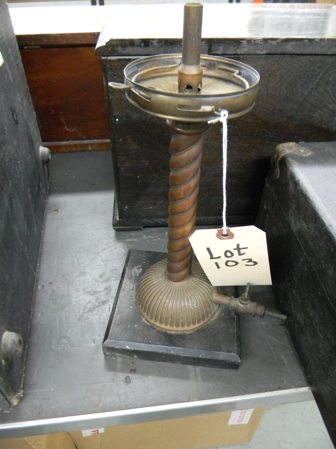 Antique brass gas lamp without globe. Base appears to be heavy slate material