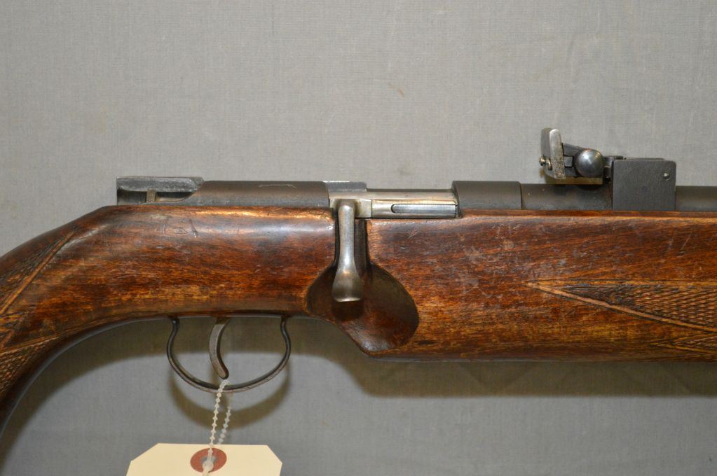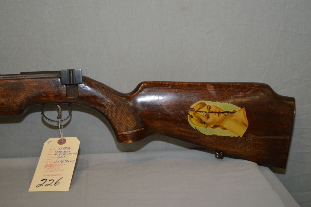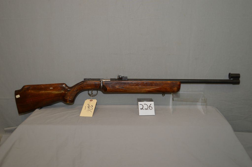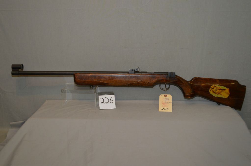 Lampagyar ( Budapest) Model Target .22 LR cal Single Shot Bolt Action Target Rifle w/ 25 1/2" heavy bbl [ blued finish, barrel sights, w/ heavy hooded front sight, also has integral peep sight base, but no peep sight, spoon style bolt, heavy target stock, w/checkered pistol grip & forend, high comb, metal butt plate w/sling swivels, has added antique style picture of young woman added to left side of butt stock, (114) ] Ser # B1890