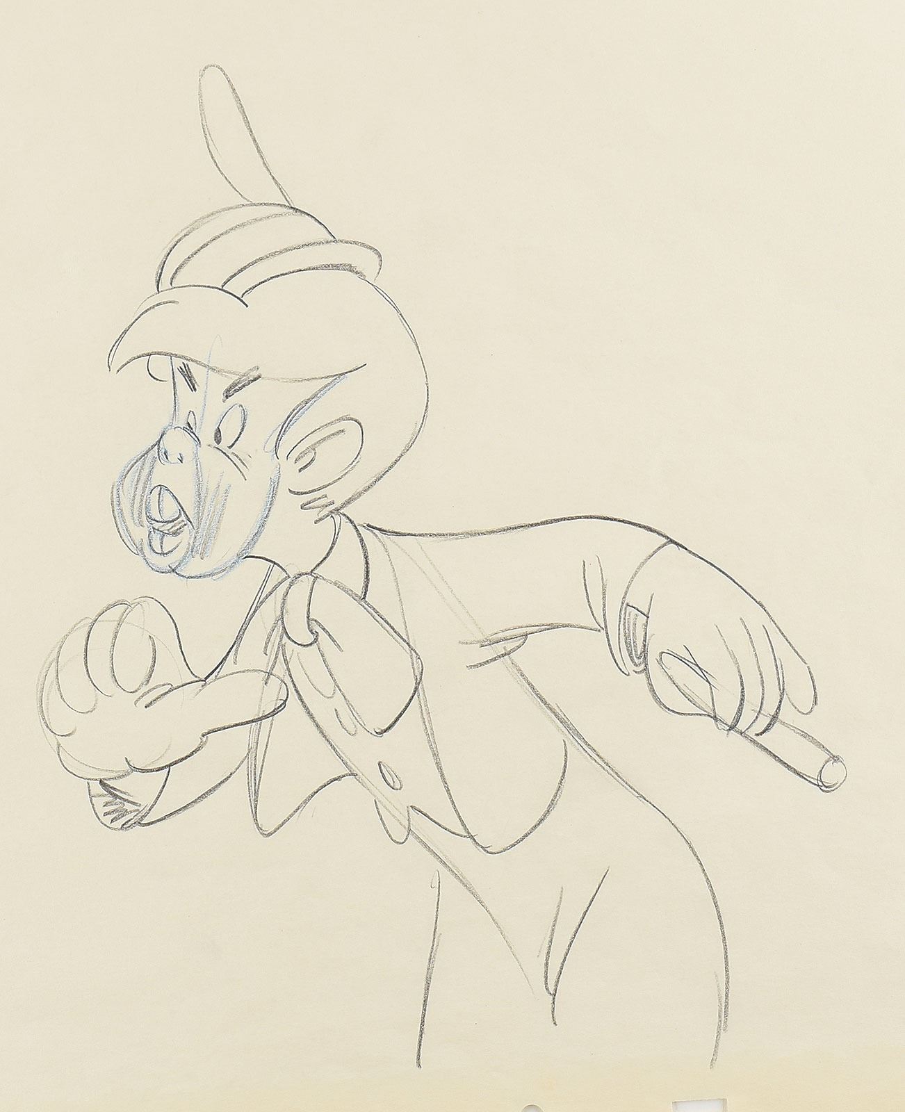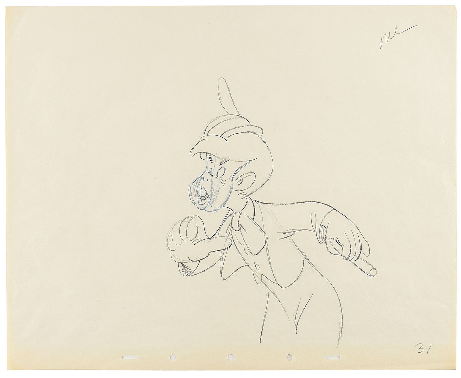(Walt Disney Studios, 1940) Original rough production drawing featuring Lampwick from Pinocchio, showing the juvenile delinquent with a cigar in one hand as he berates Pinocchio in the 'Pleasure Island' sequence. Accomplished in graphite and colored pencil on untrimmed 15.5 x 12.5 animation paper, marked "31" in the lower right corner. Image measures 7 x 9.5. In fine condition.