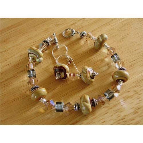 Most bodacious<p>Shimmering beauty. This bracelet is hand crafted with sandy tone lampwork beads, large cube and bi-cone Swarovski crystals in montana and lt. colorado topaz color. Bail sterling silver spacer beads for added zing! Finished with a sweet little Bali silver toggle clasp, easy on yet secure.<p>The earrings have topaz color and silver seed beads, a crystal and the matching sandy lampwork bead on Bali sterling silver french hook earwires<p>Earrings measure about 1.75 in. and the bracelet is about a 7.5 inch.<p>Add sparkle to your life in the best way possible!