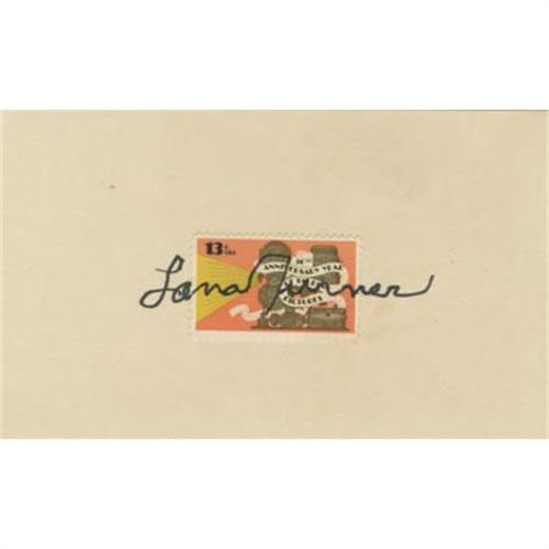 <B>Lana Turner Autograph.</B></I> A 3" x 5" card, with a 13-cent commemorative postage stamp affixed, signed by the <I>Imitation of Life</B></I> star in black ink. Turner's autograph extends across the face of the stamp. In Excellent condition.<BR><BR><b>Shipping:</b> Flat Material, Small (<a target="_blank" href="http://www.heritageauctions.com/common/shipping.php">view shipping information</a>)