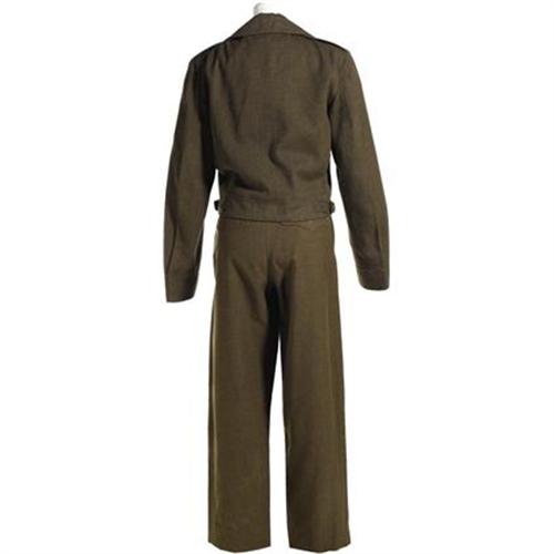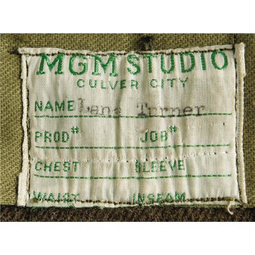 <B>Lana Turner Costume Army Uniform from "Homecoming."</B></I> This olive-drab woman's U.S. Army uniform actually looked sexy when worn by the glamorous Turner in the 1948 war drama. She co-starred in this MGM saga with Clark Gable, and considering Lana's attraction to Gable (and vice-versa), the uniform was probably quite warm while Lana wore it! Includes jacket with lieutenant's bars and an MGM costume tag bearing Turner's name sewn inside, and trousers with "L. Turner" written inside the waistband. Lana used to laugh that, during the shooting of <I>Homecoming,</B></I> her gum got caught during a kissing scene in "The King of Hollywood's" dentures. Nobody's perfect. In Excellent condition.<I>Accompanied by LOA from LA Prop & Wardrobe Company.</B></I><BR><BR><b>Shipping:</b> Clothing, Costumes & Jerseys (<a target="_blank" href="http://www.heritageauctions.com/common/shipping.php">view shipping information</a>)