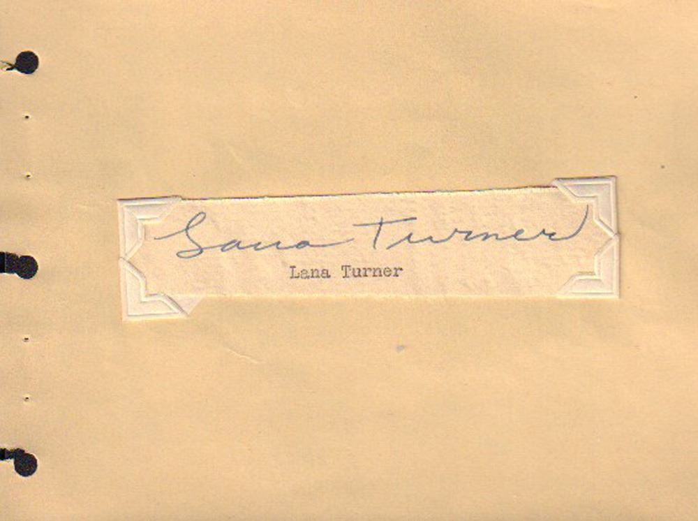 Signature clip from a letter or other document signed by Lana Turner. It has been mounted to an autograph page but is not glued down. All items come with a certificate of authenticity good for the life of the piece.