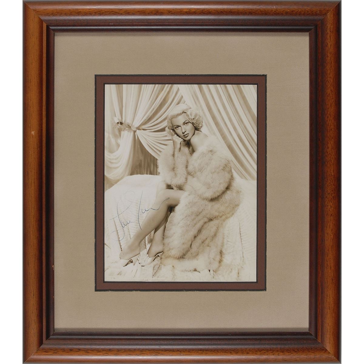 Enticing vintage glossy 7 x 9 image of Turner draped in a fur coat, signed in fountain pen. Suede-matted and framed to an overall size of 14.75 x 16.75. In fine condition, with a mild diagonal crease to the lower left. The James Collings Collection.