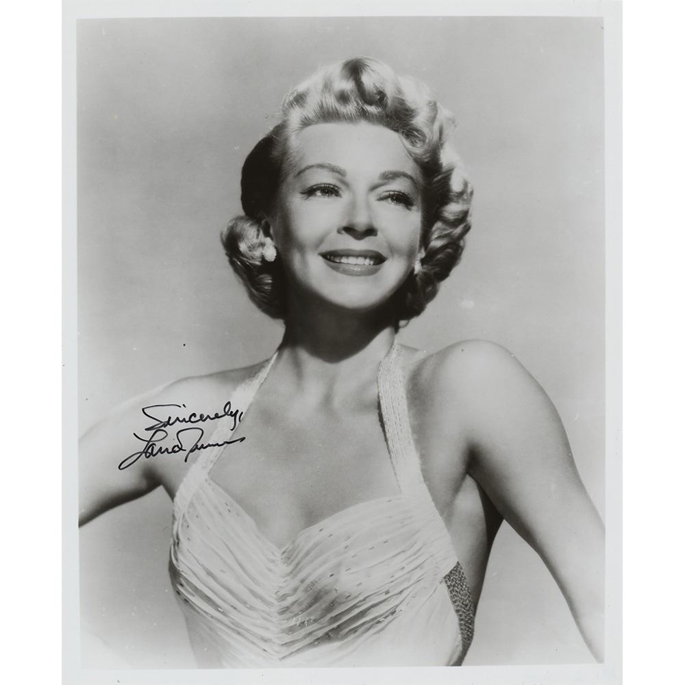 Glossy 8 x 9.75 photo of Turner in a striking sleeveless dress, signed in black felt tip, "Sincerely, Lana Turner." In fine condition, with a faint diagonal bend.
