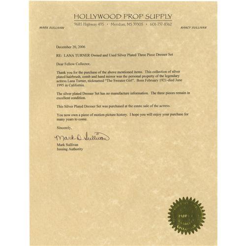 <B>Lana Turner Three-Piece Grooming Set.</B></I> This silver-plated, three-piece set includes a comb, brush, and hand mirror, in Fine to Very Fine condition with some mild to moderate tanning. Attractive vanity table items, used by one of the classic Hollywood beauties. <I>From the Lana Turner Estate. Accompanied by LOA from Hollywood Prop Supply.</B></I><I>Accompanied by LOA from Hollywood Prop Supply.</B></I><BR><BR><b>Shipping:</b> Clothing, Costumes & Jerseys (<a target="_blank" href="http://www.heritageauctions.com/common/shipping.php">view shipping information</a>)