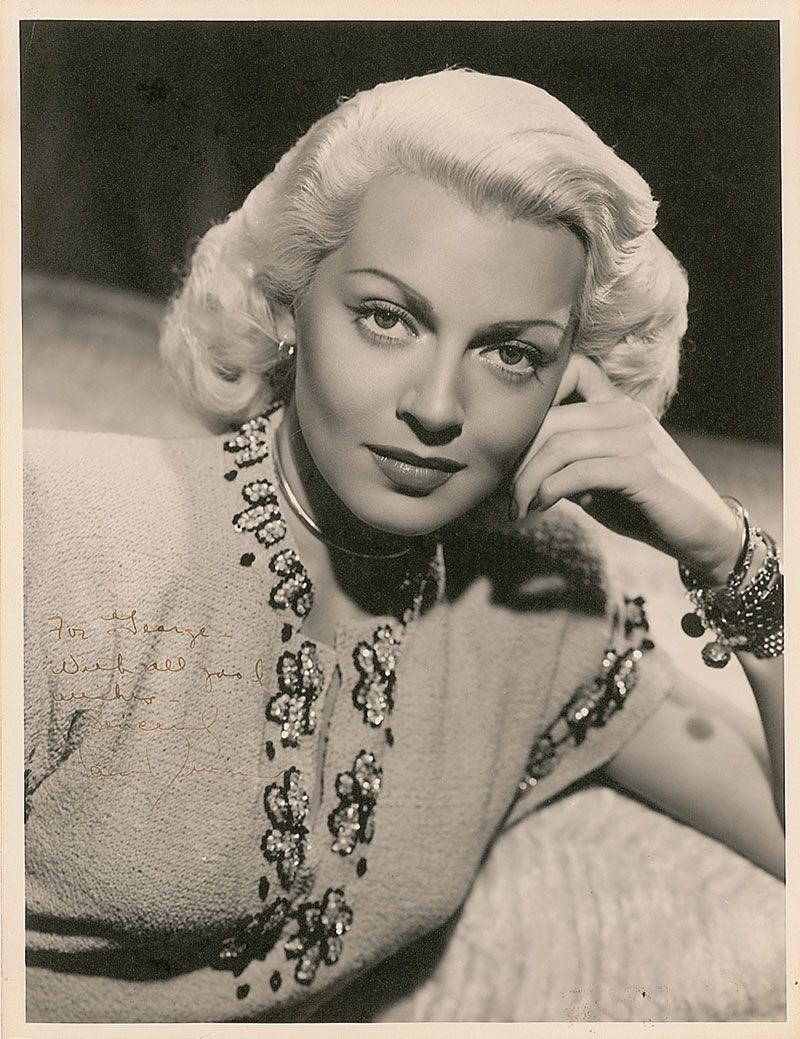 Mesmerizing vintage matte-finish 10 x 13 photo, signed and inscribed in fountain pen to assistant director George Rhein, “For George, With all good wishes, Sincerely, Lana Turner.” In very good condition, with a lightly trimmed edge, a tack hole to each bottom corner, small adhesive remnant to lower right, and signature very light, but still legible up close. Accompanied by three unsigned glossy candids of Turner, all three with Rhein, and one including Spencer Tracy on the set of Cass Timberlane.