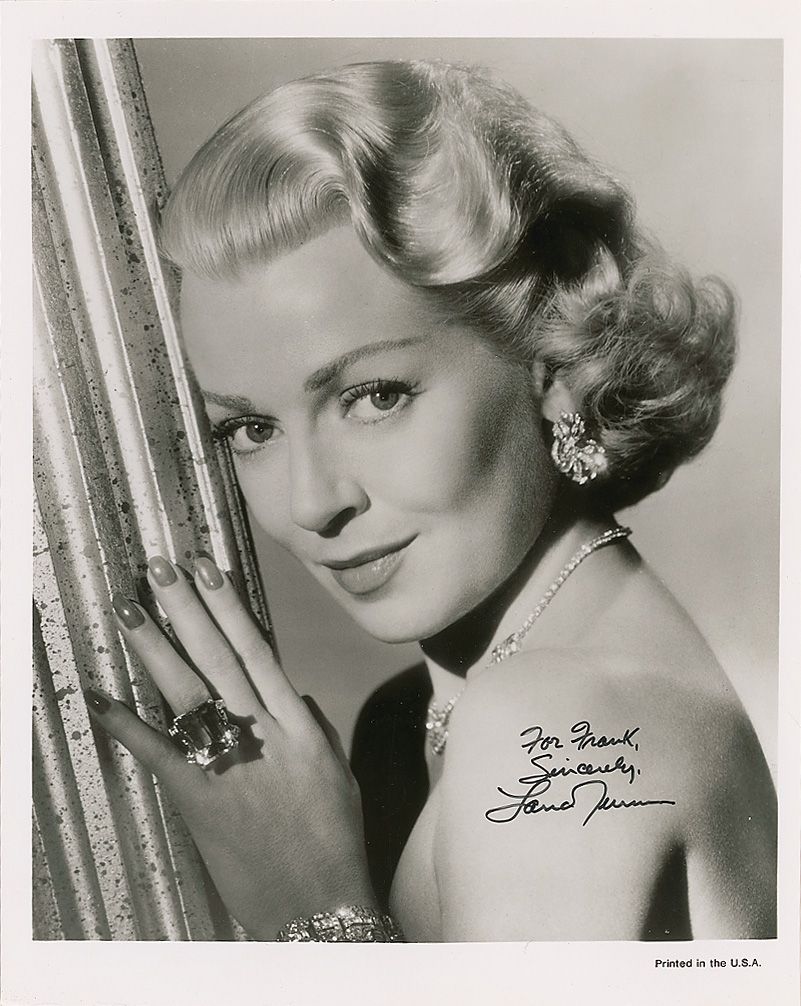 Glossy 8 x 10 photo of Turner wearing glittering jewelry, signed and inscribed in black felt tip “For Frank, Sincerely, Lana Turner.” Light scattered bends and creases, and a lightly trimmed right edge, otherwise fine condition.