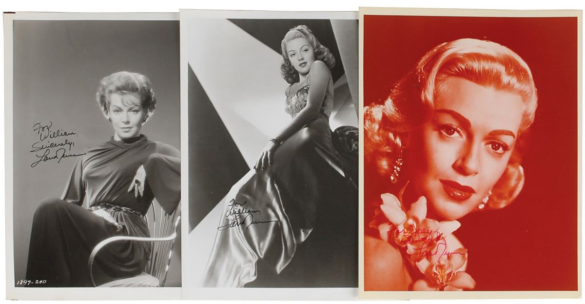Three glossy 8 x 10 photos of the glamorous femme fatale, each signed and inscribed in felt tip by Turner. In overall very good to fine condition.