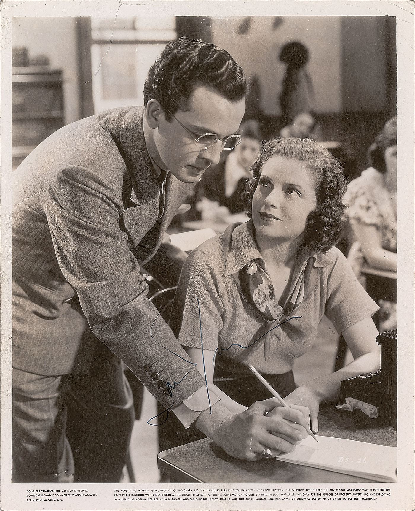Vintage glossy 8 x 10 publicity photo of Turner admiring Edward Norris in the 1937 film They Won't Forget, signed in fountain pen by Turner. In very good to fine condition, with a repaired tear descending from the top edge.