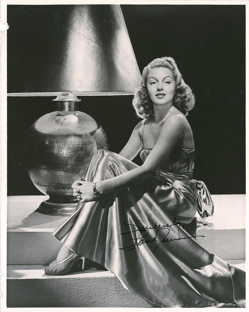 Sultry satin-finish 8 x 10 photo of the actress in a long ballgown, signed in black felt tip. In fine condition, with moderate rippling along the edges and a small area missing to the top left border (easily matted out). Pre-certified PSA/DNA and RRAuction COA.