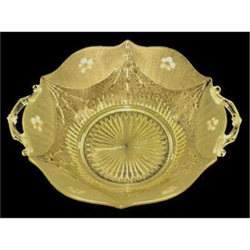 This exquisite frosted and transparent yellow Elegant Depression glass handled centerpiece or serving bowl was produced during the 1920s by the Lancaster Glass Co. of Lancaster, Ohio in their Dart pattern. Having the classic Lancaster scalloped rim, intricate geometric design, high quality etching, frosted panels and ornate handles, it is shown on pg 220 of Weatherman - Colored Glassware of the Depression Era Vol 2. Measuring 10 3/4" across the handles x 3" tall and in excellent condition