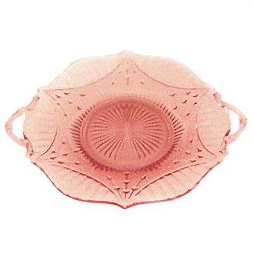 This exquisite rose pink Elegant Depression glass handled serving or sandwich tray was produced during the 1920s by the Lancaster Glass Co. of Lancaster, Ohio in their Dart pattern. Having has the classic Lancaster scalloped rim, intricate geometric design, high quality etching and ornate handles, it is shown on pg 220 of Weatherman - Colored Glassware of the Depression Era Vol 2. Measuring 12 3/4 inches across the handles x 1 1/4 inches tall and in excellent condition