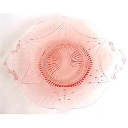 This exquisite rose pink Elegant Depression glass handled serving or sandwich tray was produced during the 1920s by the Lancaster Glass Co. of Lancaster, Ohio in their Dart pattern. Having has the classic Lancaster scalloped rim, intricate geometric design, high quality etching and ornate handles, it is shown on pg 220 of Weatherman - Colored Glassware of the Depression Era Vol 2. Measuring 12 3/4" across the handles x 1 1/4" tall and in excellent condition