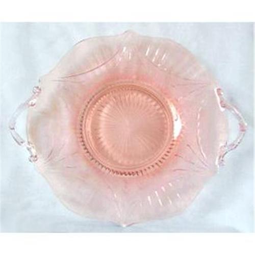 This exquisite rose pink Elegant Depression glass handled serving or sandwich tray was produced during the 1920s by the Lancaster Glass Co. of Lancaster, Ohio in their Dart pattern. Having has the classic Lancaster scalloped rim, intricate geometric design, high quality etching and ornate handles, it is shown on pg 220 of Weatherman - Colored Glassware of the Depression Era Vol 2. Measuring 12 3/4" across the handles x 1 1/4" tall and in excellent condition