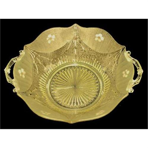 This exquisite frosted and transparent topaz yellow Elegant Depression glass handled centerpiece or serving bowl was produced during the 1920s by the Lancaster Glass Co. of Lancaster, Ohio in their Dart pattern. Having the classic Lancaster scalloped rim, intricate geometric design, high quality etching, frosted panels and ornate handles, it is shown on pg 220 of Weatherman - Colored Glassware of the Depression Era Vol 2. Measuring 10 3/4" across the handles x 3" tall and in excellent condition
