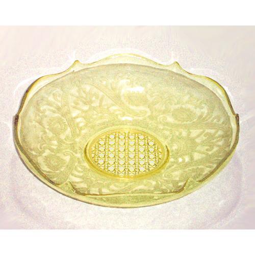 This exquisite Elegant Glass fruit bowl was made by the Lancaster Glass Co. in their Landrum Pattern with Cane bottom, aka 'Cane Landrum'. The color is catalogued as Topaz,and is a delicate straw yellow. It has the classic Lancaster scalloped rim and quality of etching, and is 11.5in. diameter by 2.5in. height. Pictured in Hazel Marie Weatherman's 'Colored Glassware of the Depression Era' vol 2