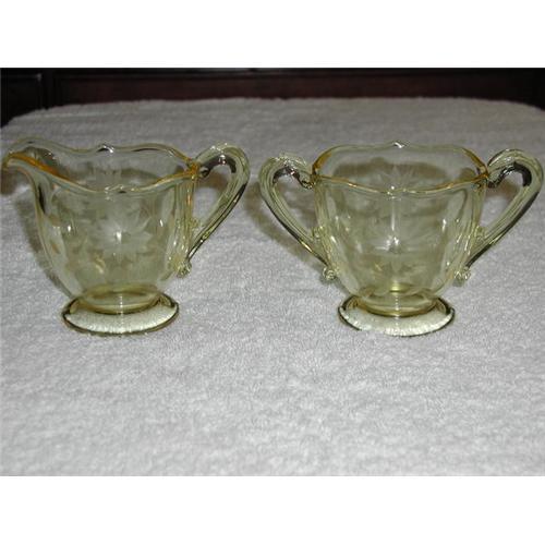 Lancaster-Jubilee-Glass Sugar and Creamer. Etched flower and vines on all sides. Beautiful Pall yellow color. See matching Lotus Bowl on my Web Site. Rare to find this color and condition.