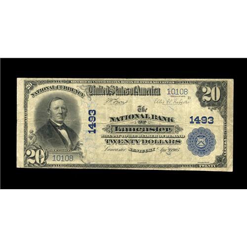 <B>Lancaster, KY</B></I> - $20 1902 Plain Back Fr. 650 <B>The NB of Lancaster</B></I> Ch. # 1493<BR>Despite issuing from 1865 through 1935, large notes from here are unaccountably scarce, and early notes from here are absent entirely from the census. Neither the Martin collection nor the Gale holdings contained any example from here earlier than Third Charter Blue Seals. <B>Fine-Very Fine.</B></I>