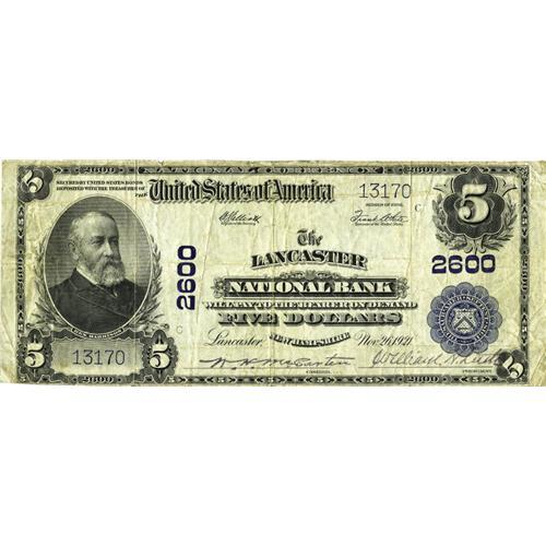 <B>Lancaster, NH</B></I> - $5 1902 Plain Back Fr. 608 <B>The Lancaster NB</B></I> Ch. # 2600<BR>Only one National Bank operated in Lancaster. This institution issued nearly $3.25 million in bank notes, though when the National Banking System ended, only about $6,000 in large size notes were still outstanding, thus accounting for the low number of survivors. This wholly original note retains the officers' signatures and pleasing paper quality. The center bend is a bit weak at the margins. <B>Fine-Very Fine.</B></I>