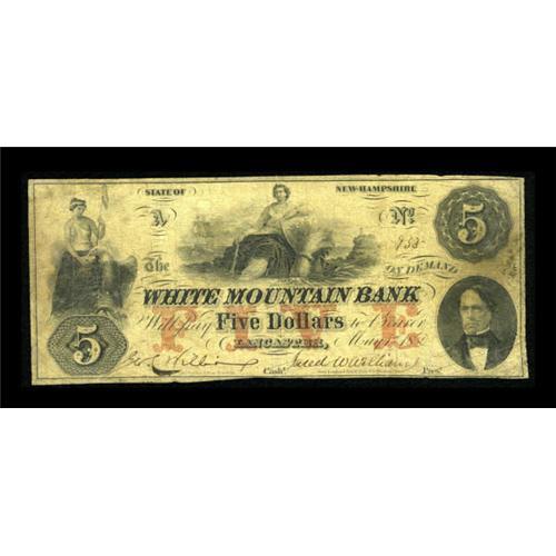 <B>Lancaster, NH- White Mountain Bank </B></I>$5 May 1, 1860 NH-160 G16a<BR> While we have handled four other examples of this issuer's notes, this is the first that is original and problem free. <B>Very Good-Fine.</B></I><BR><BR><b>Shipping:</b> Coins & Currency (<a target="_blank" href="http://www.heritageauctions.com/common/shipping.php">view shipping information</a>)