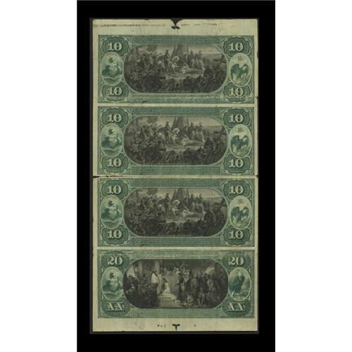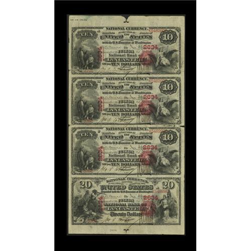 <B>Lancaster, PA</B></I> - $10/$10/$10/$20 1875 Fr. 420/435 <B>The Fulton NB</B></I> Ch. # 2634 Uncut Sheet<BR>This is an excessively rare uncut sheet which is one of only nine Series 1875 uncut sheets of all denominations in existence. It is one of only four $10-$10-$10-$20 Series 1875 sheets extant, and is the only such sheet known from the state of Pennsylvania. It has been off the market for more than ten years, and, to our best knowledge, has been offered only once to the collecting community. While there are several splits on the heavy storage folds, the colors are wonderfully bright and the notes quite high grade. The full selvage is also present at both the top and the bottom. <B>Very Fine,</B></I> a great rarity worthy of a place in the most advanced of collections.