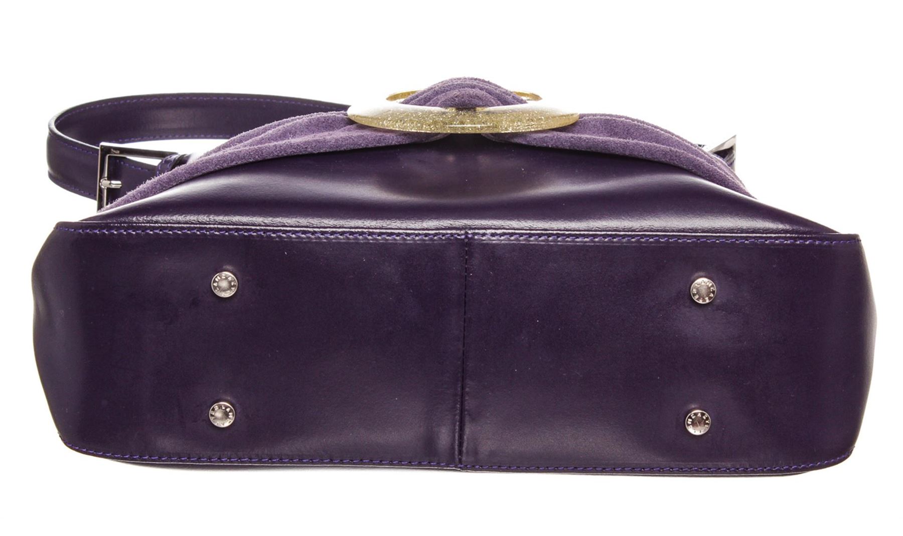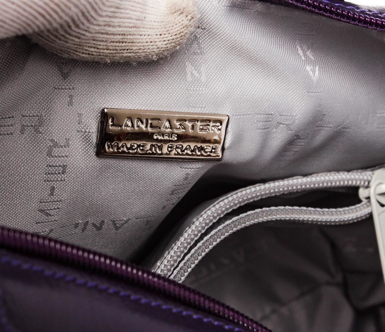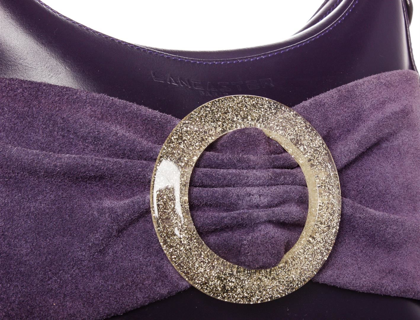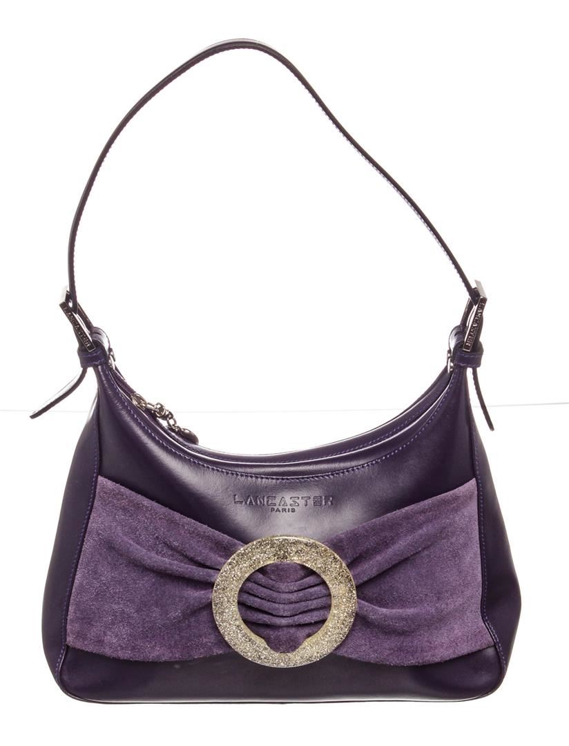 One Lancaster Purple Leather Small Shoulder Bag. Crafted our of purple leather, single flat adjustable strap, and zip top closure. Inner gray fabric lining.          MKX