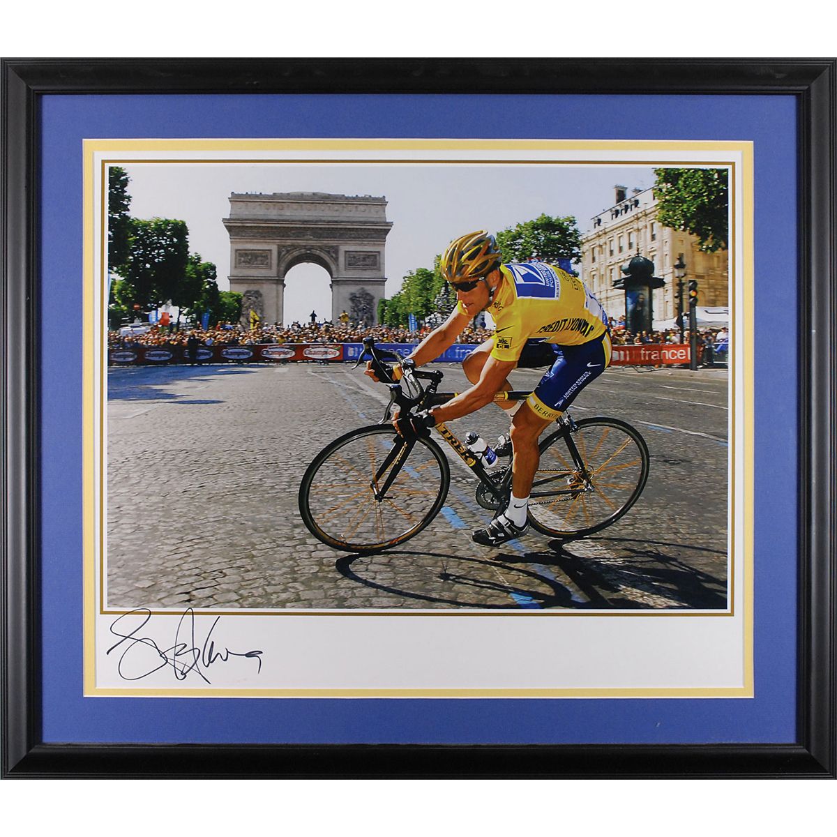Color 23.25 x 19.5 print of Armstrong rounding a corner in front of the Arc de Triomphe during the Tour de France, signed in the lower border in black felt tip. Double-matted and framed to an overall size of 30.5 x 26.5. In very fine condition. Oversized.
