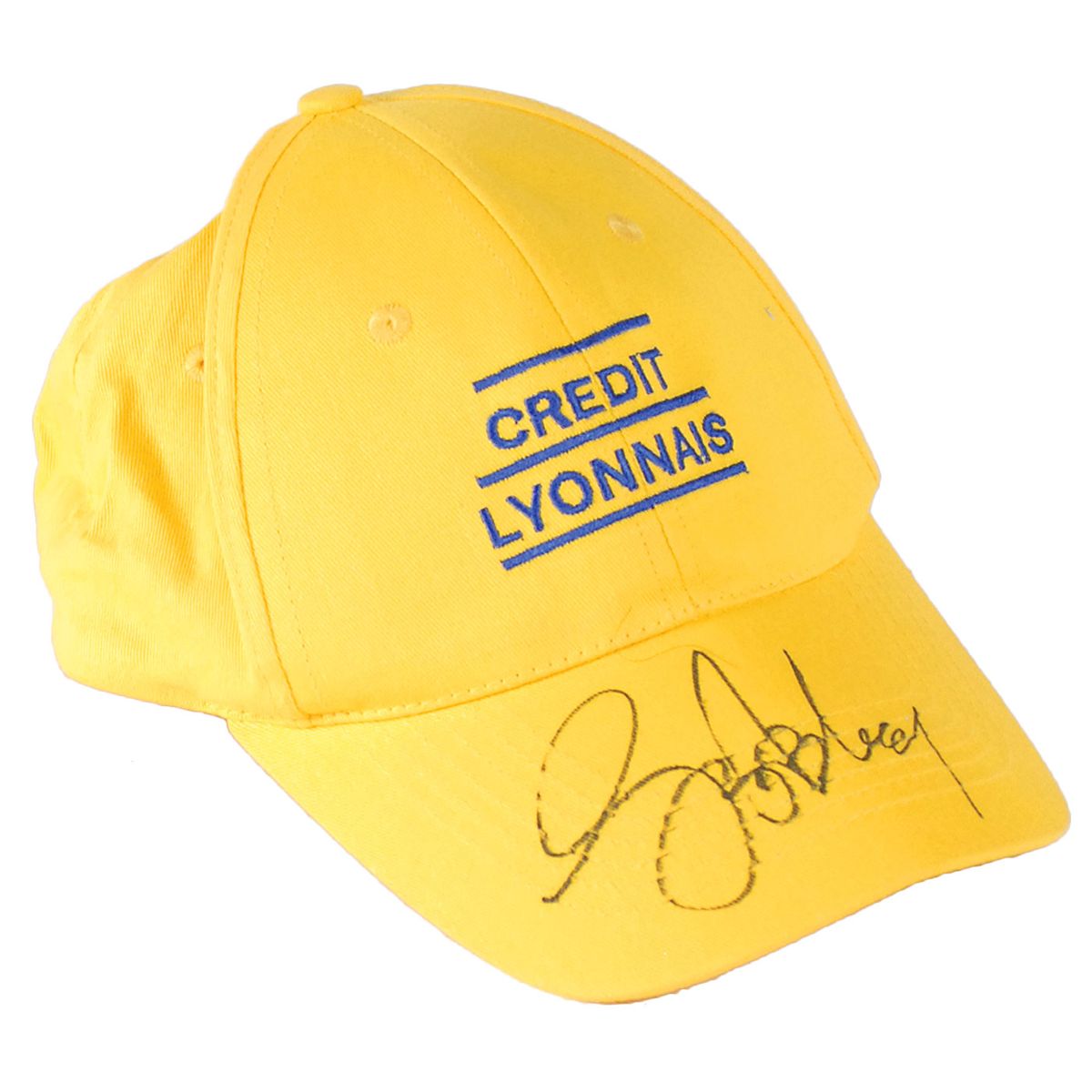 Yellow Credit Lyonnais adjustable baseball cap, signed on the bill in black felt tip by Armstrong. In fine condition.