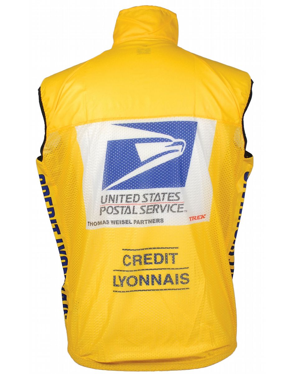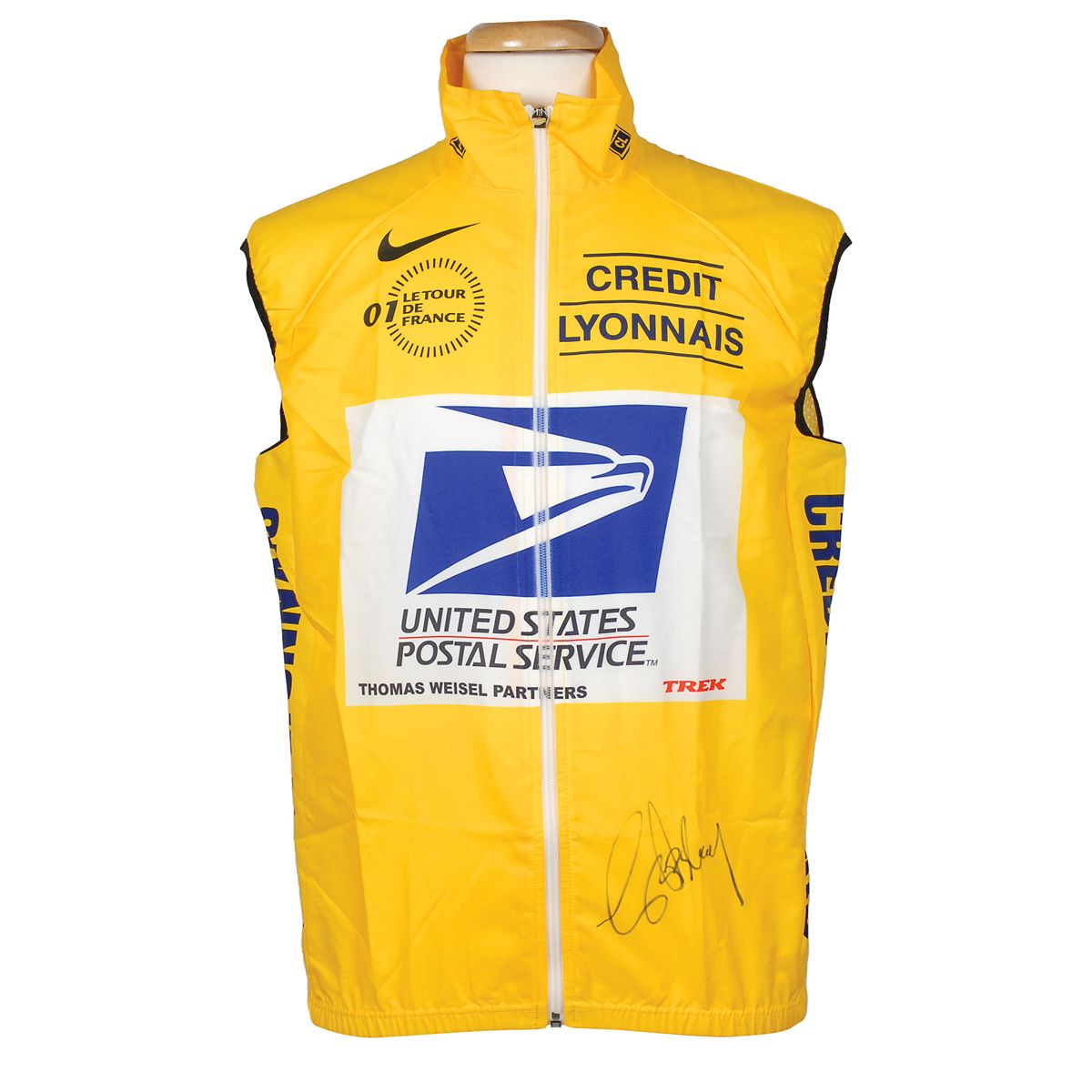 Armstrong’s race-worn official yellow Nike cycling vest from the 2001 Tour de France, size large, signed on the front in black felt tip. The vest consists of a solid polyester zippered front and mesh back, bearing numerous sponsors’ logos including the United States Postal Service, Credit Lyonnais, Trek, Thomas Weisel Partners, and Nike, as well as the 2001 Tour de France emblem. In fine condition. Accompanied by a photo of Armstrong wearing a similar jersey and a certificate of authenticity from Joe Taylor, stating that the vest is “race used direct from the Tour de France,” and that “Nike does not make these for the public and no replicas are made. Only the leaders of the Tour de France get these in their ‘race kit.’”