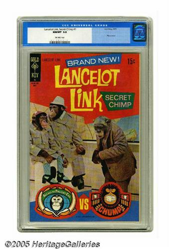 <B>Lancelot Link Secret Chimp #1 (Gold Key, 1971) CGC NM/MT 9.8 Off-white pages.</B></I> Photo cover. Overstreet 2005 NM- 9.2 value = $90. CGC census 1/05: 2 in 9.8, none higher. <I>From the collection of Chris Bell.</B></I>