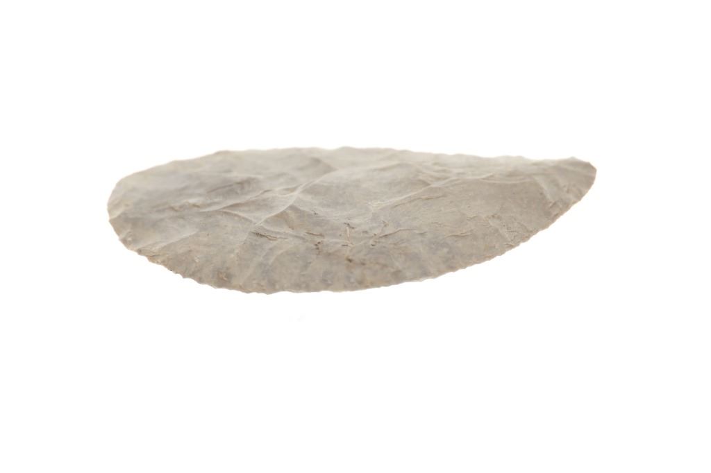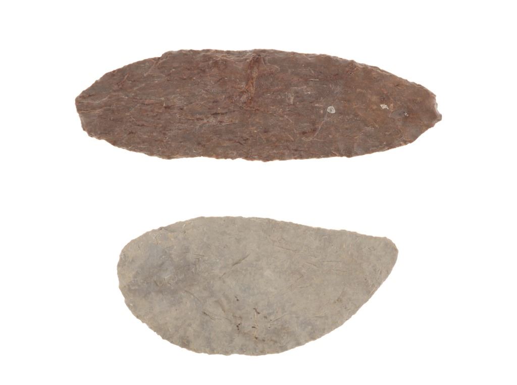 Featured in this lot it is this Lanceolate point collection circa Archaic Period. There are two points in this collection. The first is a knife blade circa the Archaic period with a serrated edge and a sharp tip. The second is a ovoid blade that shows a serrated blade with a sharp edge and is constructed from chert grey material. The condition of this collection of good with no obvious signs of damage and shows good overall condition. The measurements of this pair of points are 4 1/2" x 1 5/8" x 1/2" and 3 5/8" x 1 3/4" x 3/8". The collective weight of this pair of points is U6oz.