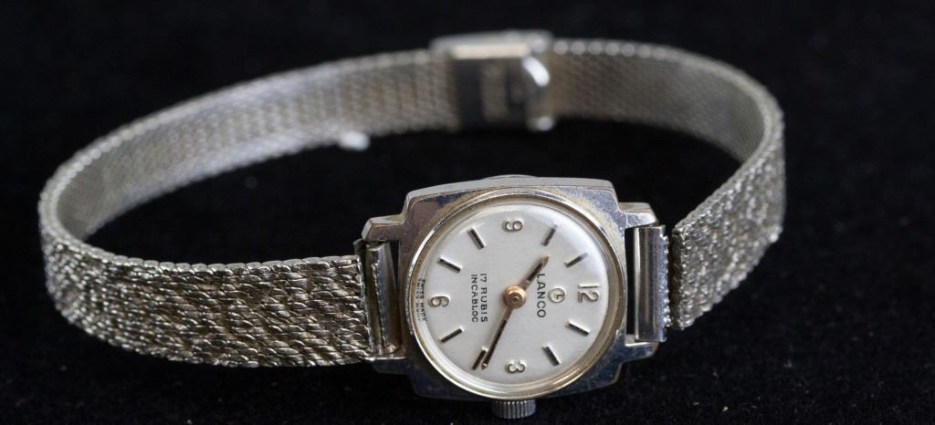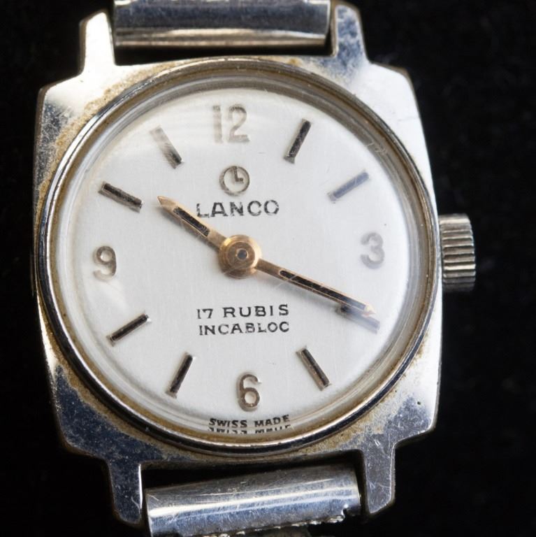 Ladies watch. Lanco brand. Swiss made. "17 Rubis Incabloc" printed on watch face above the 6 o'clock position. "STAINLESS STEEL BACK WATERPROTECTED ANTIMAGNETIC 1526 LANCO SWISS MADE" inscribed on the back. "1/20-10KT.GF Kreisler" inscribed on inside of clasp. Diameter: 6.5 cm, 22 grams. Watch face: 2cm (edge to edge).