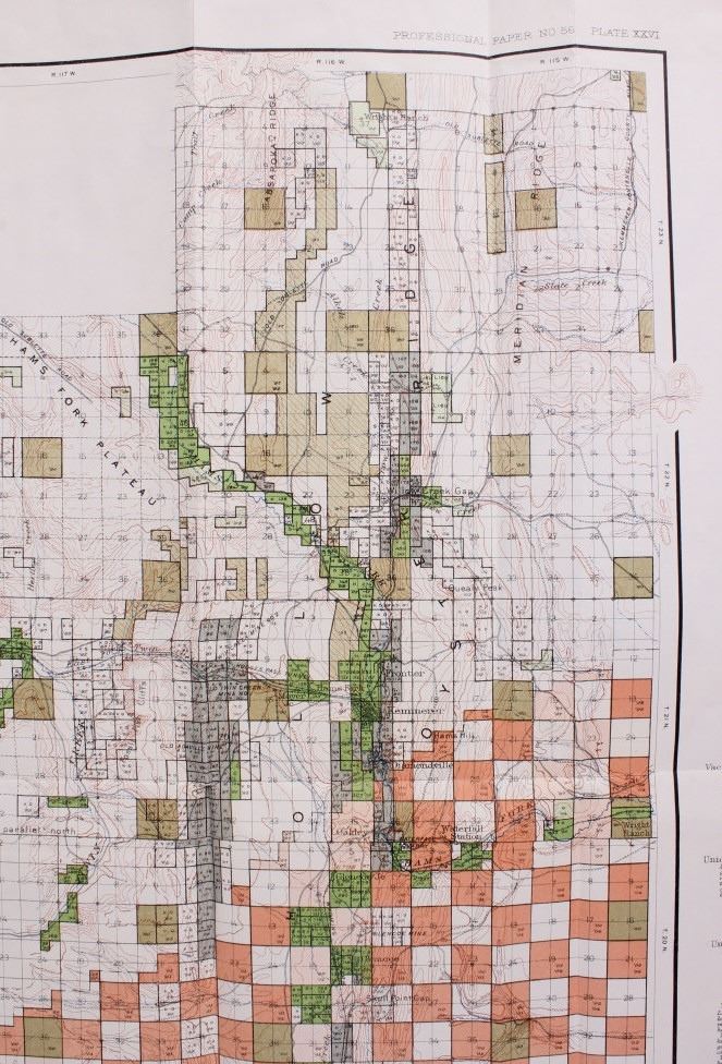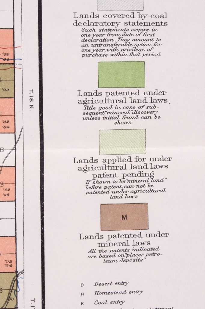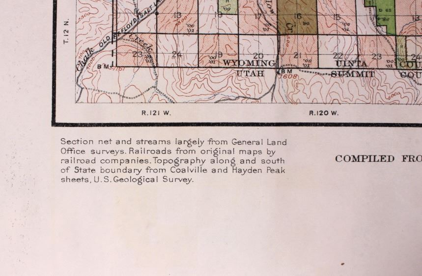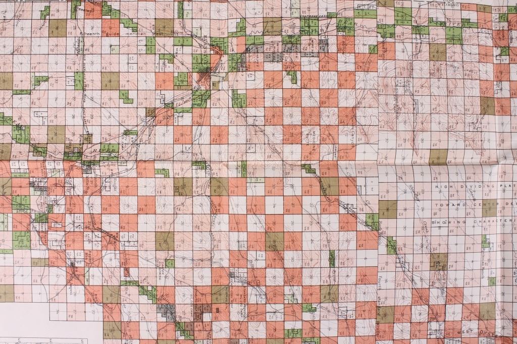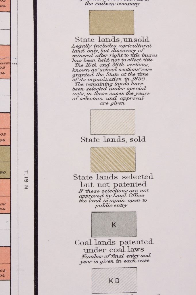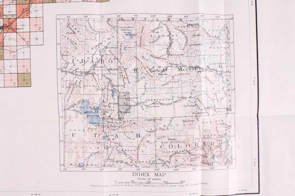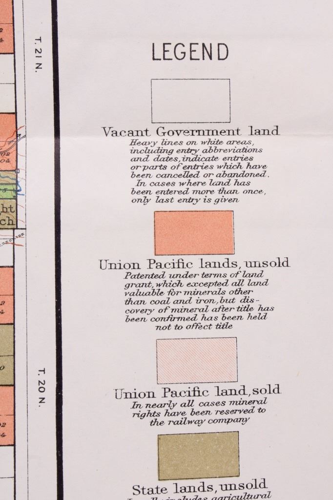 Featured in this lot is this Land Office Map of a portion of southwestern Wyoming, circa 1906. The map shows regional information, including Vacant Government Land, Union Pacific Land Unsold, Union Pacific Land Sold, and much more. The condition of this land map is good with a single small tear in one of the folds of the map. The measurements of this official land map are 40" x 22".
