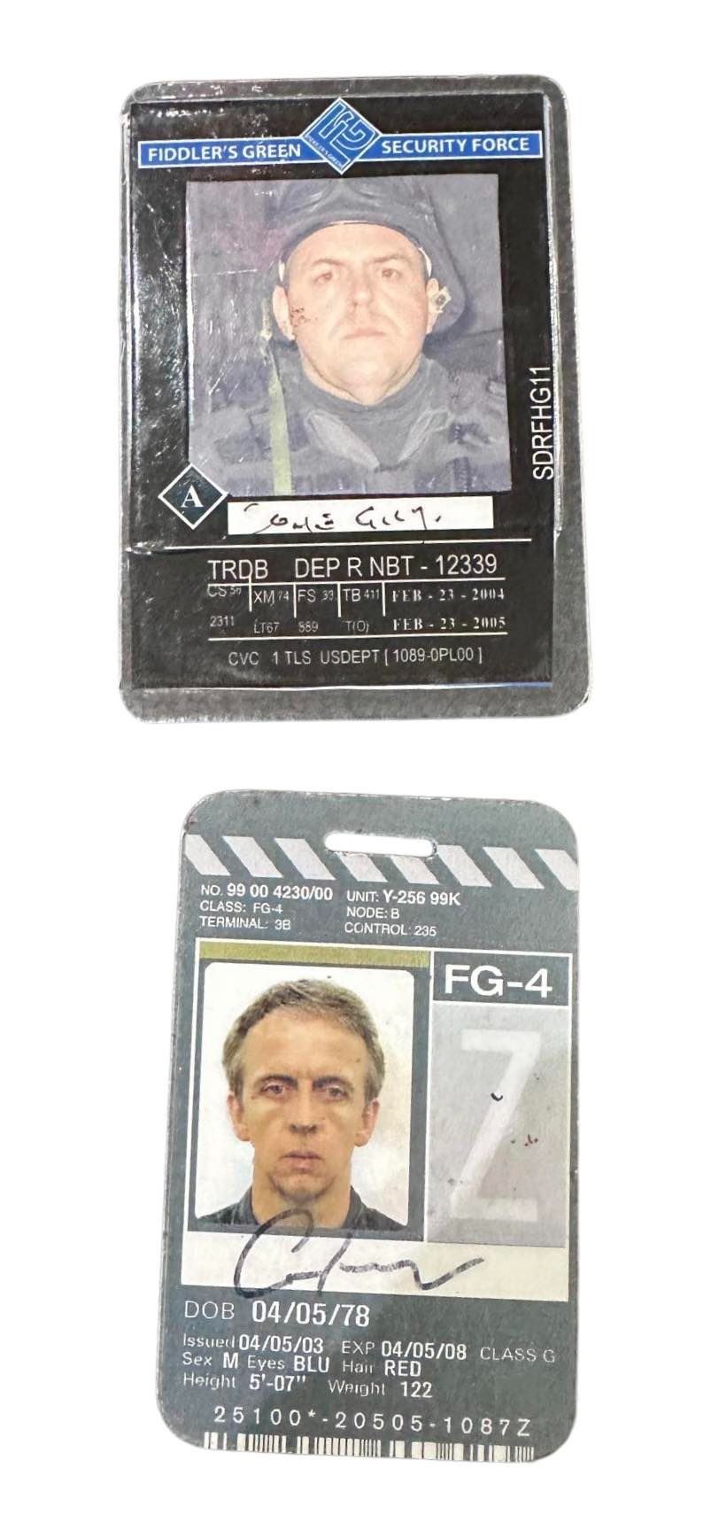 Original set of two ID's, one for FG-4 and one for the security force, used in the George A. Romero directed post-apocalyptic horror film 'Land of the Dead' (2005), where the living dead have taken over the world, and the last humans live in a walled city to protect themselves as they come to grips with the situation.