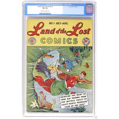 <B>Land of the Lost #1 (EC, 1946) CGC VF+ 8.5 Off-white to white pages.</B></I> Based on the Mutual Coast-to-Coast radio program. Overstreet 2006 VF 8.0 value = $219; VF/NM 9.0 value = $327. CGC census 5/06: 2 in 8.5, 2 higher. <BR><BR><B>Important notice:</B> Heritage usually auctions material at the rate of 200-250 lots per hour. On some occasions eBay Live bid software or the Internet may not be able to keep up with the pace of the auction. We recommend placing a realistic absentee bid now as insurance to avoid disappointment. Occasionally the auctioneer may eliminate or reject an eBay Live bid, and the auctioneer may also reopen a lot after the close of the eBay live bidding (usually because we missed an audience bid), and may reject your bid even if it shows you as the winning bidder. By bidding via eBay Live, you agree that Heritage may award the lot to another bidder at its sole discretion under the circumstances described above or any other reasonable circumstances. Since eBay bids are not shown to us until we open the lot on the floor, we treat those bids just like floor bids. In most cases the floor responds before the eBay bid is presented to us, due to Internet lag time, so for consistency we have made it a policy that floor bids are always considered first over tie eBay live bids. Also please note that all Heritage lots purchased through eBay Live carry a 22.5% Buyer's Premium. Please make sure you read the Terms and Conditions before you bid. This lot is being auctioned in conjunction with a live floor auction by Heritage Auction Galleries. All final auction and invoice information will be supplied by Heritage Auction Galleries, and all other information should be considered preliminary. Lot:41001 <BR><BR><B>Winning Notification and Billing:</B> After the FINAL session in this auction is complete, Heritage will send e-mail and snail mail invoices. This process normally takes several days. All final auction and invoice information will be supplied by Heritage Auction Galleries, and all other information should be considered preliminary. <BR><BR>This auction will be conducted on a live auction floor and over the Internet through eBay Live. If you choose to place an absentee bid, please take a moment to <font color='#0000ff'><u><a href='http://pages.ebay.com/liveauctions/help/before/laabsentee.html'>learn how eBay Live absentee bidding works</a></u></font><font color='#000000'>