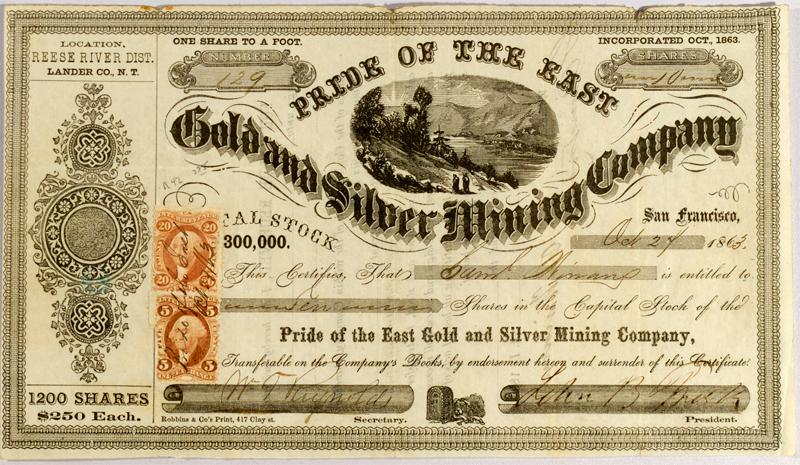 Lander County,NV - October 24, 1863 - Pride of the East Gold and Silver Mining Company Stock *Territ