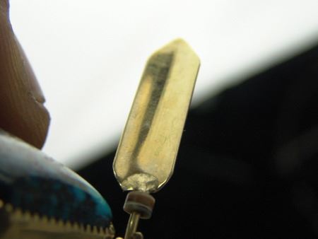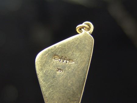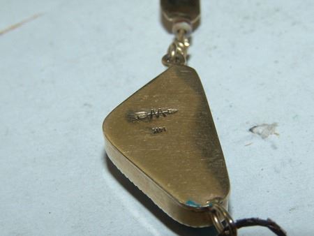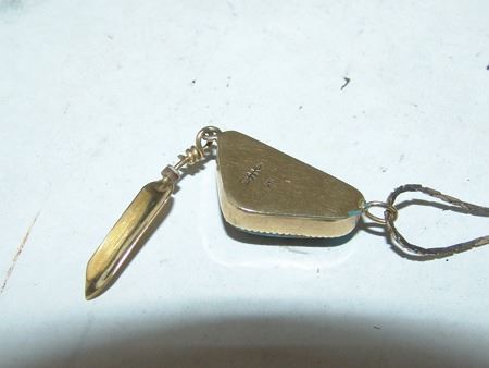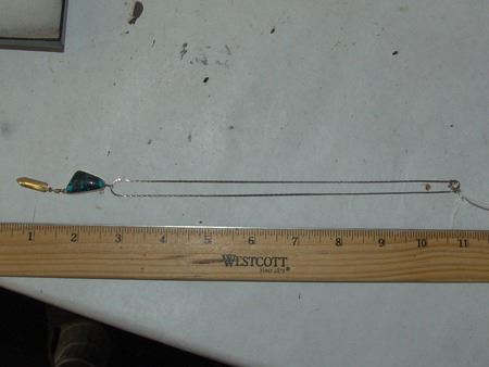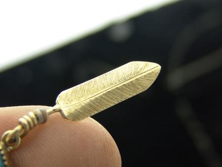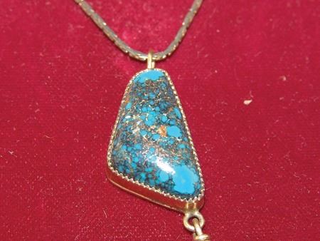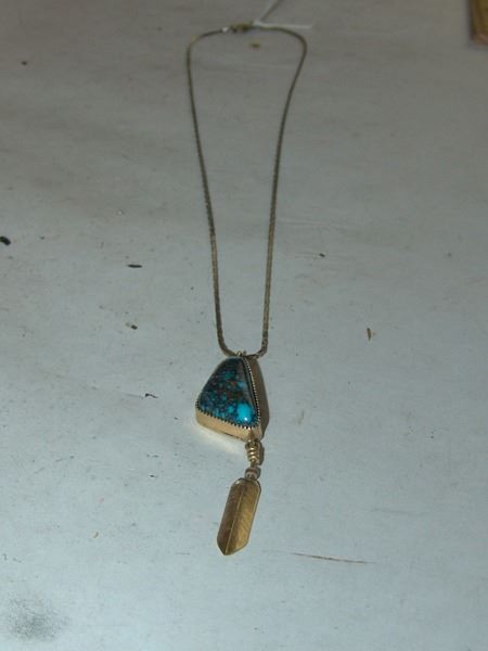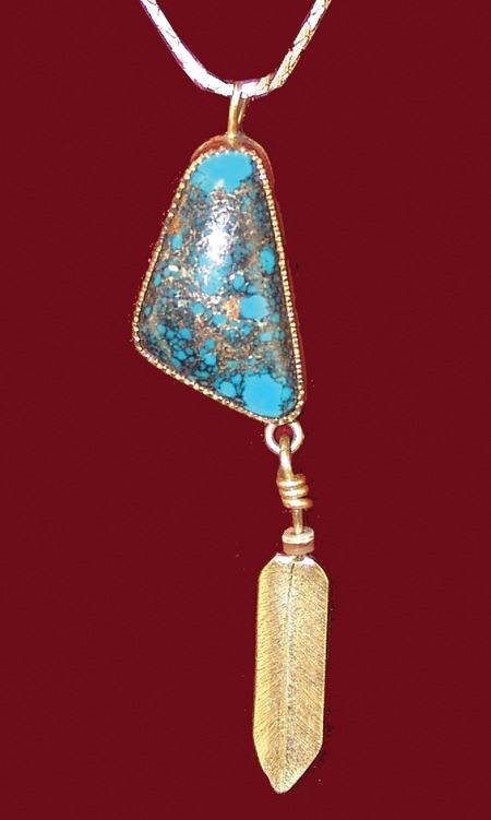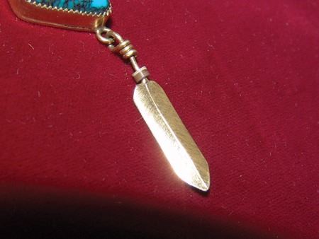 Late 1900s, Beautiful finely made 14KT gold pendant with Lander blue turquoise stone and gold feather drop. Excellent condition. Original retail $3250. 16" long, 1" x 1/2" x 1/4" + feather