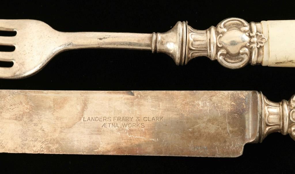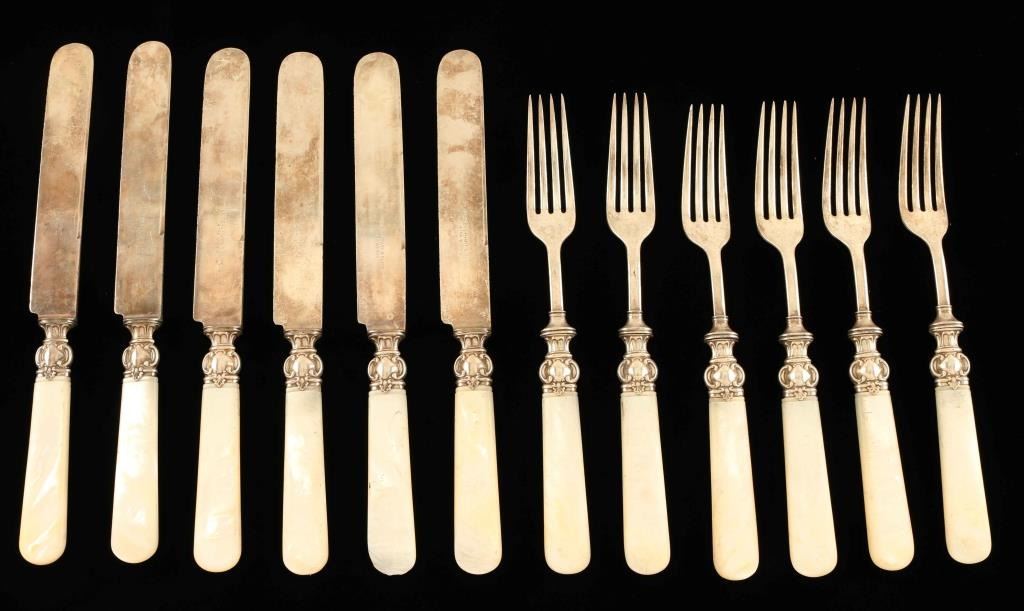 Silverware. Six knives and six forks with a fancy scroll and column pattern just above mother of pearl handles. All knives are maker marked. Show use. A very elegant set.