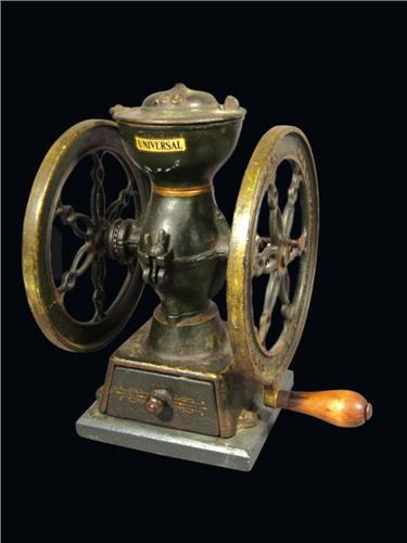 Landers Frary and Clark Coffee Mill #20, Universal Company. Original finish, good condition. 12 1/2 inches tall, wheel 8 1/2 inch dia.
