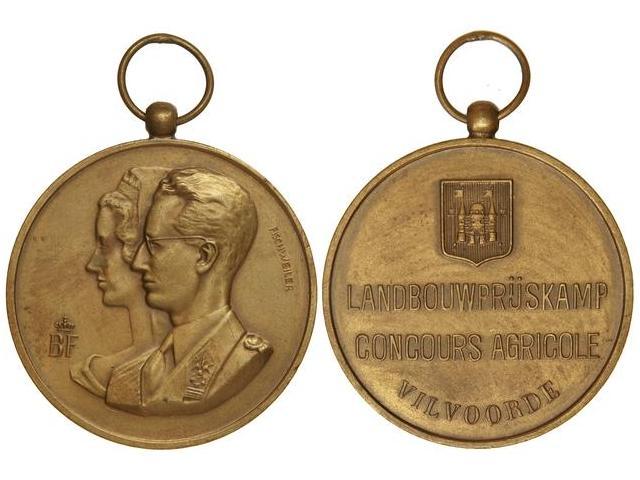 Landouwprüsfamp Concours Agricole Vilvoorde. - S/F. - BÉLGICA. - Anv.: Balduino y Fabiola. Bustos acodados a izquierda. Rev.: Inscripción y escudo. Latón. Ø 50 mm. Con anilla. EBC+. - -