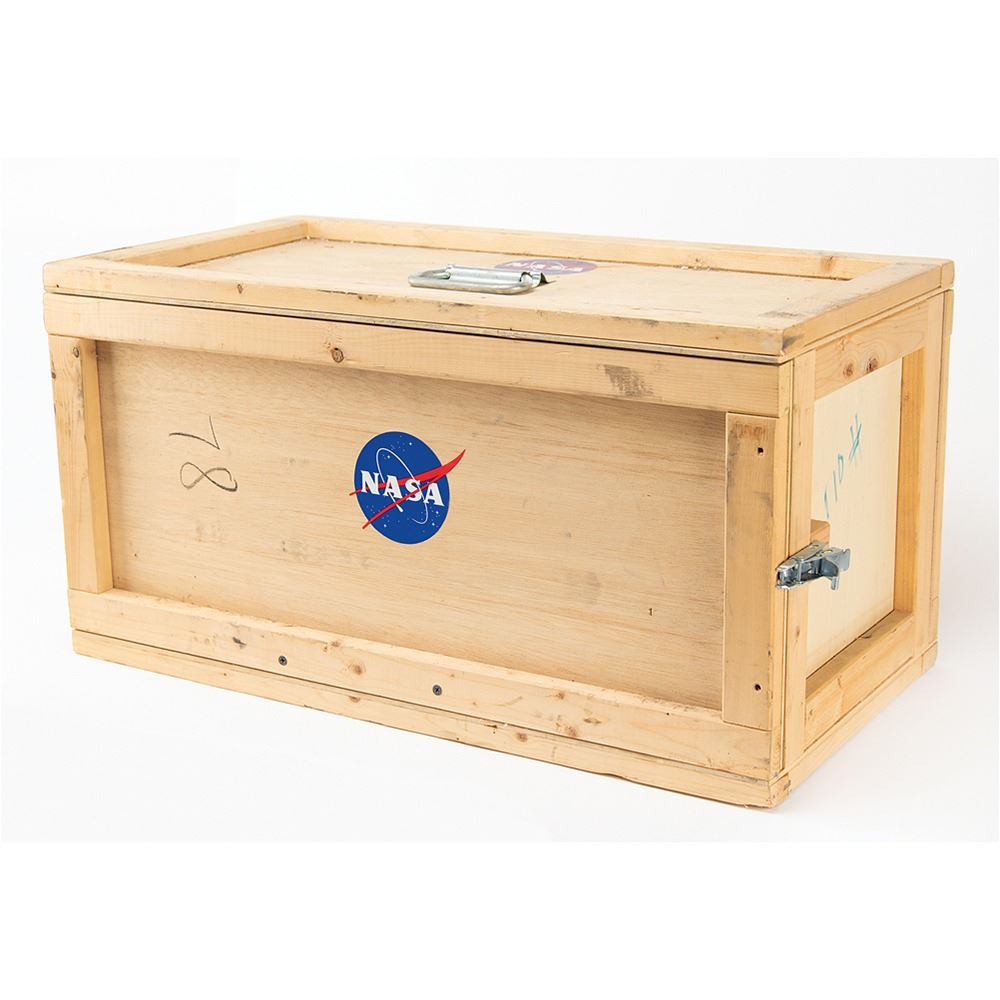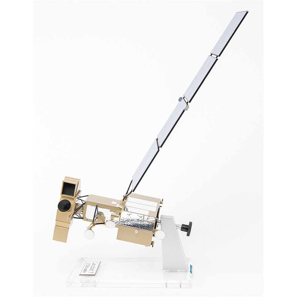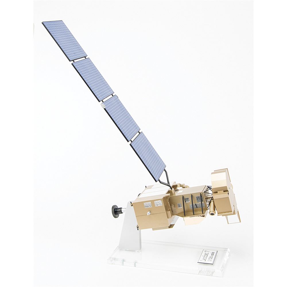 Impressive NASA-owned 1:15 scale model of the Landsat 7 satellite built by Central Art & Engineering, Inc., of Allentown, New Jersey, housed in its 26.5Ë x 13.75Ë x 13.75Ë wooden crate bearing several affixed NASA logos. The model measures approximately 10Ë x 7.5Ë x 29Ë (with much of its height due to the large upright solar array), and is displayed on an attractive acrylic stand with engraved nameplate. In fine condition.