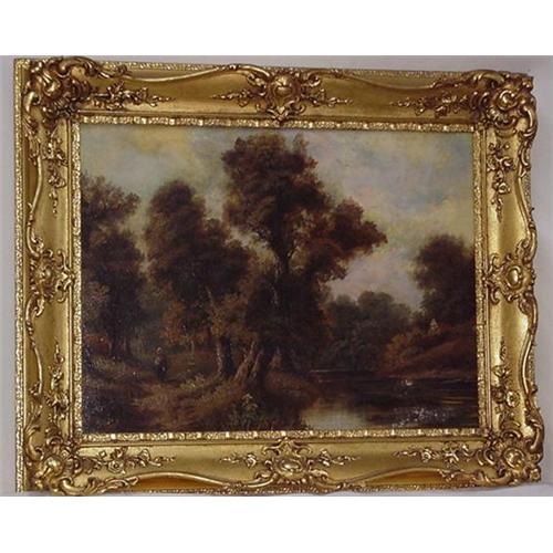 Large framed oil painting on canvas, 36'' x 28''. Frame size, 47'' x 38 1/2''. Canvas mounted on masonite. Landscape of woodland scene near a river, a female figure walking on the path surrounded by trees. A small cottage is seen on the opposite shore. Beautifully painted. Label on back reads; R.S.A. Exhibition 1916, Name;W.A.Gibson Address; 9 Fremont Terrace,Dowanhill, Glasgow Some loss to paint as shown.