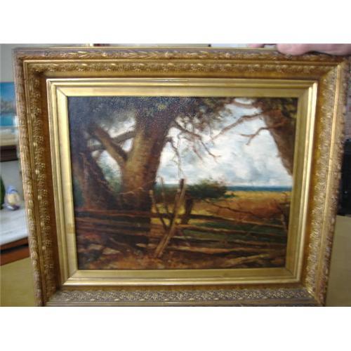 Oil on canvas,Landscape Tree and Split-rail Fence. Age Mid 1800's. Canvas 13"by 10.5.