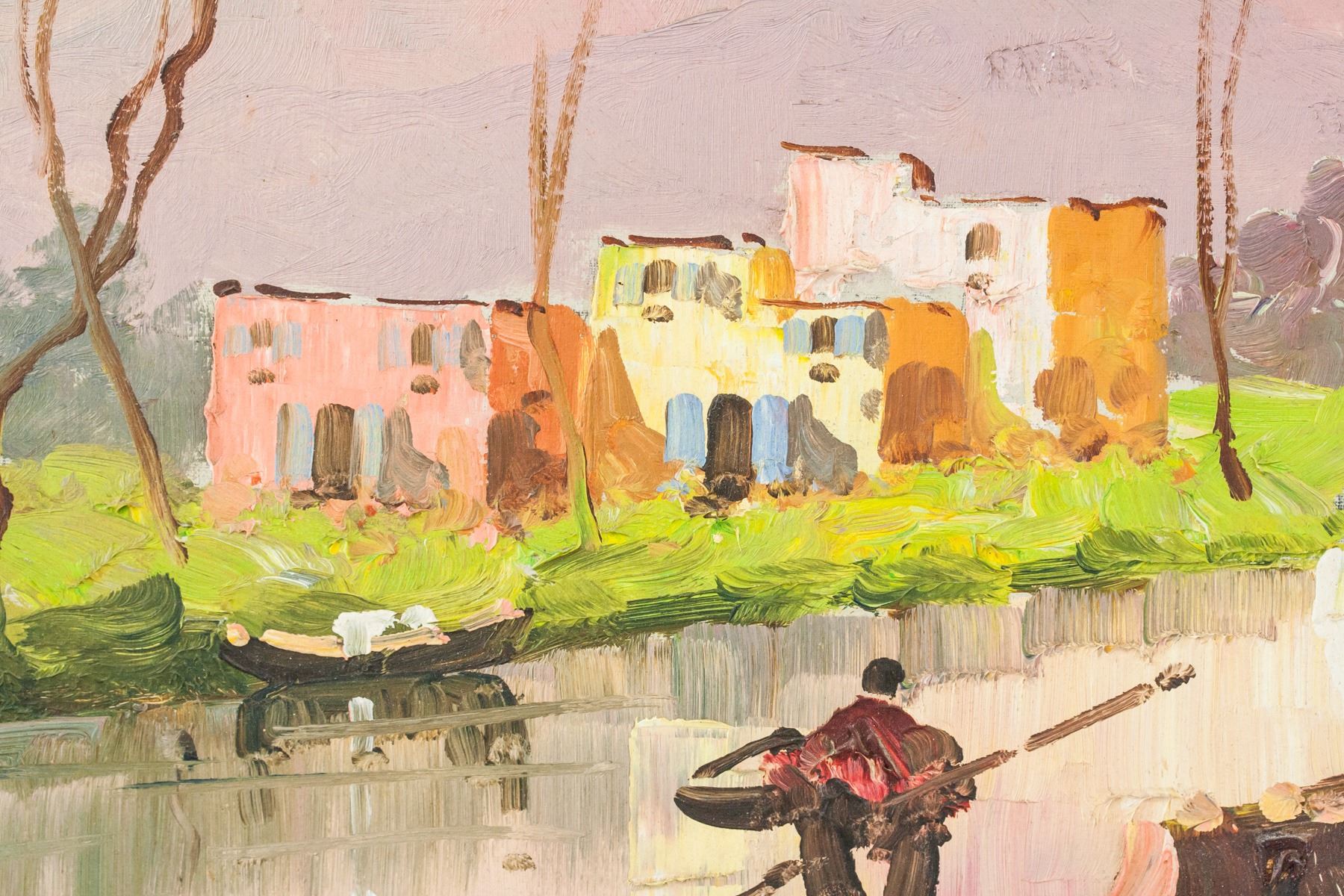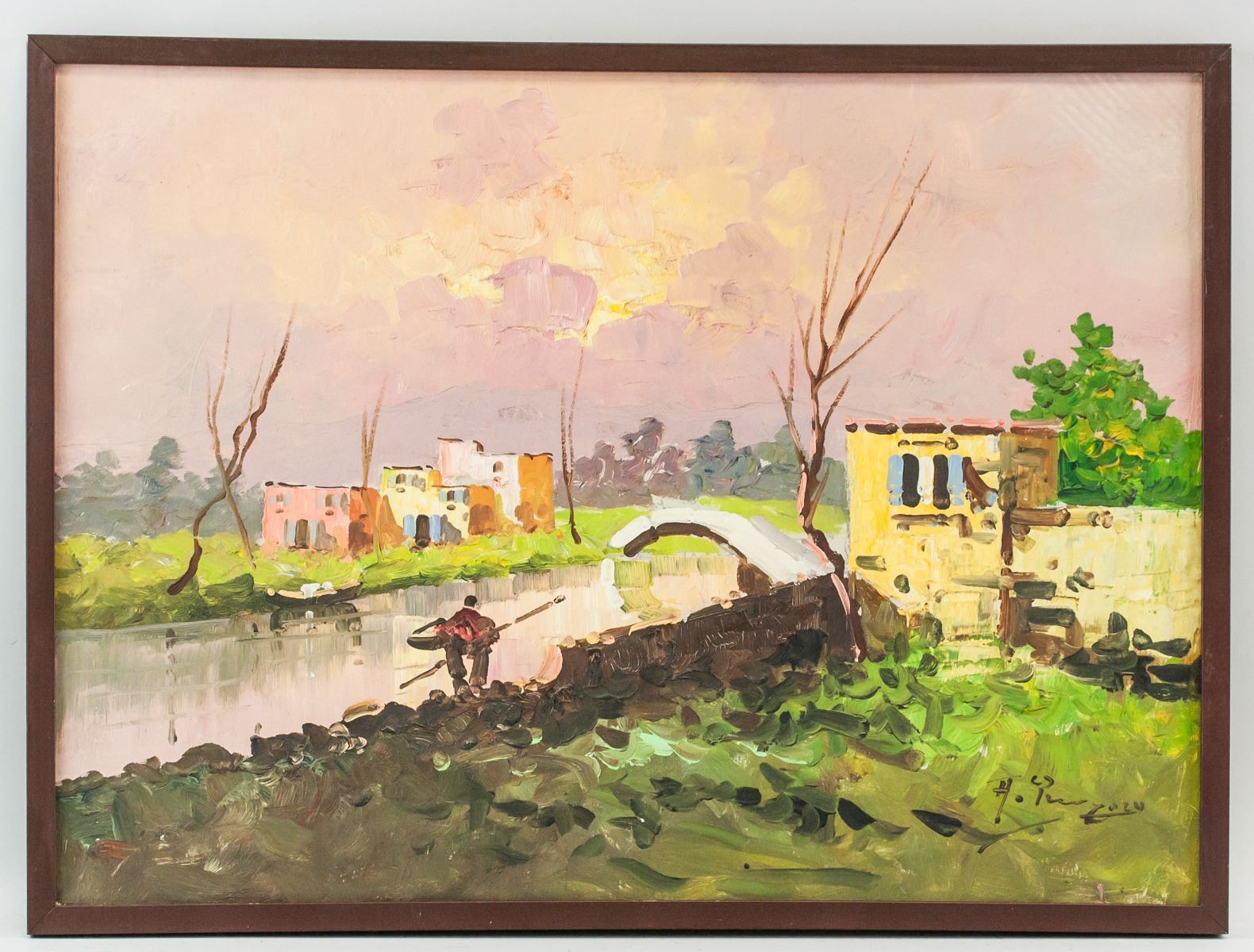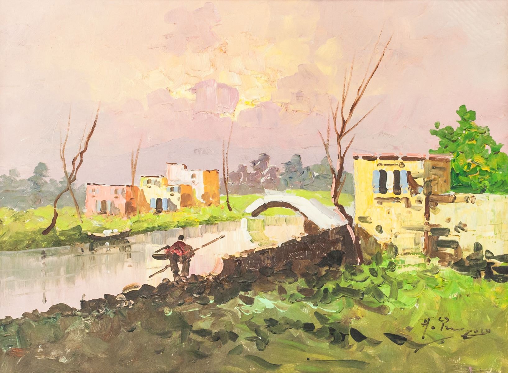 Oil on canvas, framed. Featuring farmer by the river. Signed "H. Yan Zuzu" in the bottom right corner. 51 x 69 cm (20 x 27.25 inches).
